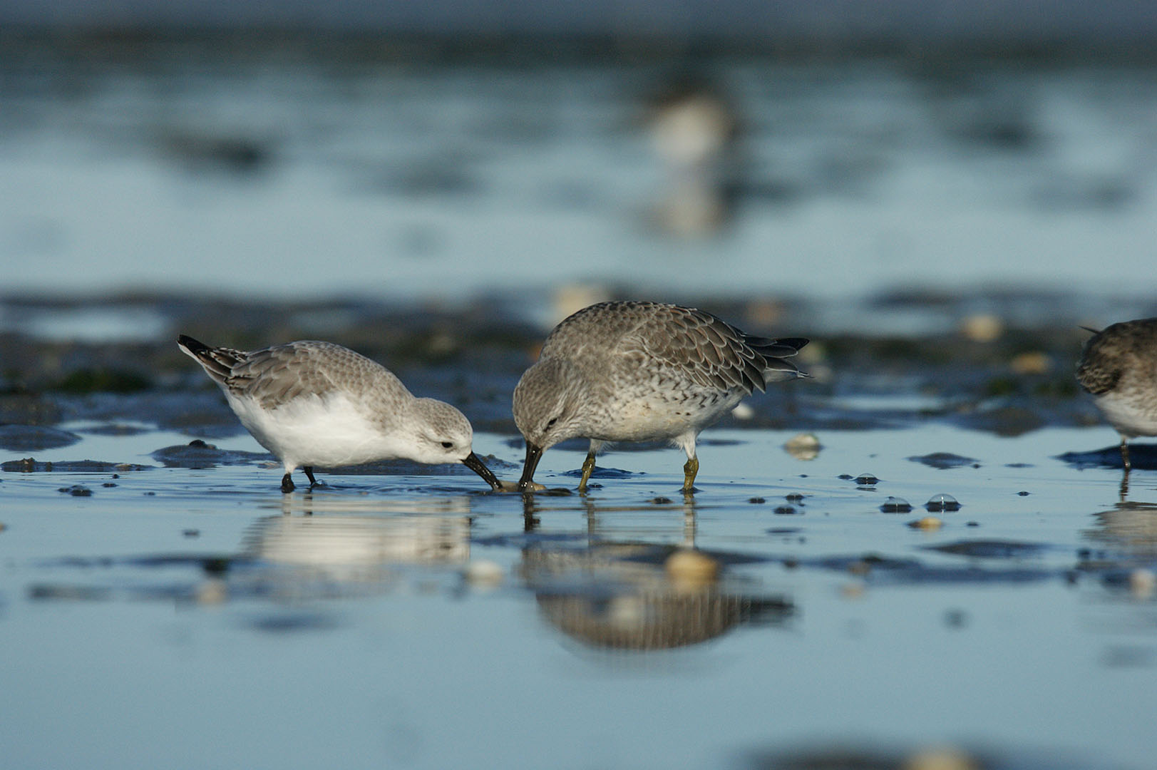 De tailles variables, les chevaliers, bécasseaux et combattants muent deux fois par an. Ils alternent entre plumage nuptial et internuptial, ce dernier étant celui généralement observé en Bretagne lors des séjours hivernaux.