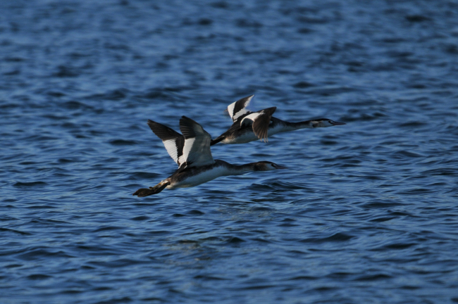 Parmi les grèbes, que l’on regroupe en vingt-deux espèces, certains sont visibles à l’année ; les autres, qui sont de type migrateur, nous arrivent généralement à l’automne, poussés par la rigueur des régions septentrionales où ils se reproduisent. La plupart hiverne en groupe. Les grèbes se plaisent soit sur l’eau, soit sous l’eau, et sont peu adaptées à la marche sur terre où ils ne vont que très rarement. Le vol n’est pas non plus leur spécialité car leurs ailes sont relativement petites et leur musculature pectorale est peu développée. Tous les grèbes sont par contre de remarquables plongeurs. Ainsi, le grèbe castagneux, plongeur à répétition infatigable, peut rester de 10 à 30 secondes sous la surface. Le grèbe huppé plonge avec une douceur caractéristique et ne provoque que de légers remous. Ils sont présents en Bretagne, tout comme le grèbe à cou noir et le grèbe esclavon.